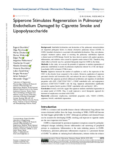 Skurikhin, E., Pershina, O., Zhukova, M., Widera, D. orcid id iconORCID: https://orcid.org/0000-0003-1686-130X, Pan, E., Pakhomova, A., Krupin, V., Ermakova, N., Skurikhina, V., Sandrikina, L., Morozov, S., Kubatiev, A. and Dygai, A. (2021) Spiperone stimulates regeneration in pulmonary endothelium damaged by cigarette smoke and lipopolysaccharide. International Journal of Chronic Obstructive Pulmonary Disease, 16. pp. 3575-3591. ISSN 1178-2005 doi: 10.2147/COPD.S336410