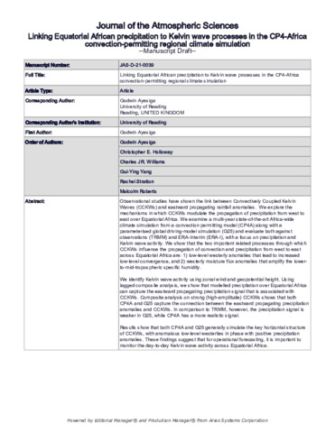 Ayesiga, G., Holloway, C. E. orcid id iconORCID: https://orcid.org/0000-0001-9903-8989, Williams, C. J. R., Yang, G.-Y. orcid id iconORCID: https://orcid.org/0000-0001-7450-3477, Stratton, R. and Roberts, M. (2022) Linking Equatorial African precipitation to Kelvin wave processes in the CP4-Africa convection-permitting regional climate simulation. Journal of the Atmospheric Sciences, 79 (5). pp. 1271-1289. ISSN 1520-0469 doi: 10.1175/JAS-D-21-0039.1