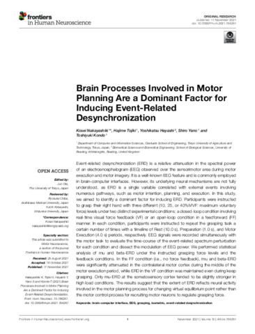 Nakayashiki, K., Tojiki, H., Hayashi, Y. orcid id iconORCID: https://orcid.org/0000-0002-9207-6322, Yano, S. and Kondo, T. (2021) Brain processes involved in motor planning are a dominant factor for inducing event-related desynchronization. Frontiers in Neuroscience, 15. 764281. ISSN 1662-453X doi: 10.3389/fnhum.2021.764281