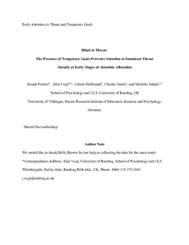 Blind to threat: the presence of temporary goals prevents attention to imminent threat already at early stages of attention allocation.