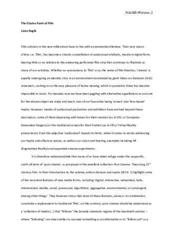 Film scholars in the new millennium have to live with an existential dilemma. Their very raison d’être, i.e. ‘film’, has become a chaotic constellation of audiovisual artefacts, mostly in digital form, bearing little or no relation to the endearing perforated film strip that continues to illustrate so many of our activities. Whether as synonymous to ‘film’ or as the name of film theatres, ‘cinema’ is equally undergoing an identity crisis in an environment dominated by giant Video-on-Demand (VoD) streamers, cashing in on the easy pleasure of home-viewing, which in pandemic times has become impossible to resist. For decades now we have been juggling with alternative appellations to account for the elusive object we study and teach, two of our favourites being ‘screen’ and ‘lens-based’ media. However, modes of audiovisual production and exhibition have evolved beyond these descriptors, some of them dispensing with lenses for their creation (as in CGI, or Computer-Generated Imagery) or the traditional screen for their fruition (as in VR or Virtual Reality productions). Even the adjective ‘audiovisual’ reveals its limits, when it comes to works addressing our haptic and olfactory senses, as well as our vision and hearing, examples including AR (Augmented Reality) and expanded-cinema experiments.