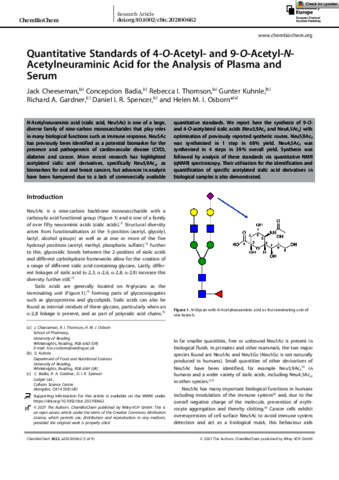 N-Acetyl neuraminic acid (sialic acid, Neu5Ac) is one of a large, diverse family of nine-carbon monosaccharides that play roles in many biological functions such as immune response. Neu5Ac has previously been identified as a potential biomarker for the presence and pathogenesis of cardiovascular disease (CVD), diabetes and cancer. More recent research has highlighted acetylated sialic acid derivatives, specifically Neu5,9Ac2, as biomarkers for oral and breast cancers, but advances in analysis have been hampered due to a lack of commercially available quantitative standards. We report here the synthesis of 9-O-acetyl and 4-O-acetyl sialic acids (Neu5,9Ac2 and Neu4,5Ac2) with optimisation of previously reported synthetic routes. Neu5,9Ac2 was synthesised in 1 step in 68% yield. Neu4,5Ac2 was synthesised in 4 steps in 39% overall yield. Synthesis was followed by analysis of these standards via quantitative NMR (QNMR). Their utilisation for the identification and quantification of specific acetylated sialic acid derivatives in biological samples is also demonstrated.