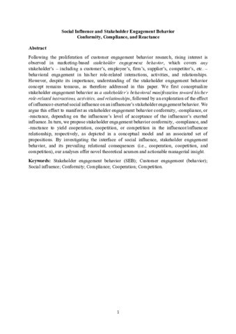 Following the proliferation of customer engagement behavior research, rising interest is observed in marketing-based stakeholder engagement behavior, which covers any stakeholder’s – including a customer’s, employee’s, firm’s, supplier’s, competitor’s, etc. – behavioral engagement in his/her role-related interactions, activities, and relationships. However, despite its importance, understanding of the stakeholder engagement behavior concept remains tenuous, as therefore addressed in this paper. We first conceptualize stakeholder engagement behavior as a stakeholder’s behavioral manifestation toward his/her role-related interactions, activities, and relationships, followed by an exploration of the effect of influencor-exerted social influence on an influencee’s stakeholder engagement behavior. We argue this effect to manifest as stakeholder engagement behavior conformity, -compliance, or -reactance, depending on the influencee’s level of acceptance of the influencor’s exerted influence. In turn, we propose stakeholder engagement behavior conformity, -compliance, and -reactance to yield cooperation, coopetition, or competition in the influencor/influencee relationship, respectively, as depicted in a conceptual model and an associated set of propositions. By investigating the interface of social influence, stakeholder engagement behavior, and its prevailing relational consequences (i.e., cooperation, coopetition, and competition), our analyses offer novel theoretical acumen and actionable managerial insight.