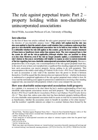 Wilde, D. (2022) The rule against perpetual trusts: part 2 – property holding within non-charitable unincorporated associations. Trust Law International, 35 (4). pp. 223-245. ISSN 0962-2624