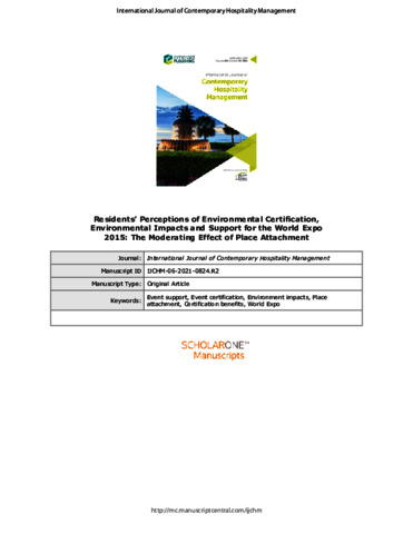 Residents’ perceptions of environmental certification, environmental impacts and support for the World Expo 2015: the moderating effect of place attachment