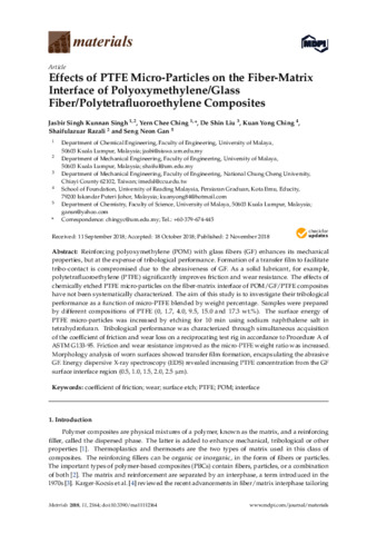 Kunnan Singh, J. S., Ching, Y. C., Liu, D. S., Ching, K. Y. orcid id iconORCID: https://orcid.org/0000-0002-1528-9332, Razali, S. and Gan, S. N. (2018) Effects of PTFE micro-particles on the fiber-matrix interface of polyoxymethylene/glass fiber/polytetrafluoroethylene composites. Materials, 11 (11). 2164. ISSN 1996-1944 doi: 10.3390/ma11112164