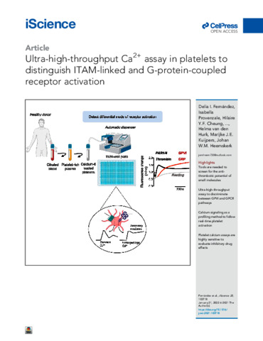 Fernández, D. I. orcid id iconORCID: https://orcid.org/0000-0002-5055-9019, Provenzale, I., Cheung, H. Y. F., van Groningen, J., Tullemans, B. M. E., Veninga, A., Dunster, J. L. orcid id iconORCID: https://orcid.org/0000-0001-8986-4902, Honarnejad, S. orcid id iconORCID: https://orcid.org/0000-0002-4558-501X, van den Hurk, H., Kuijpers, M. J. E. and Heemskerk, J. W. M. (2021) Ultra-high throughput Ca2+ assay in platelets to distinguish ITAM-linked and G-protein coupled receptor activation. iScience, 25 (1). 103718. ISSN 2589-0042 doi: 10.1016/j.isci.2021.103718