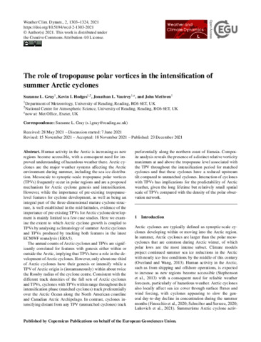 Gray, S. L. orcid id iconORCID: https://orcid.org/0000-0001-8658-362X, Hodges, K. I. orcid id iconORCID: https://orcid.org/0000-0003-0894-229X, Vautrey, J. L. and Methven, J. orcid id iconORCID: https://orcid.org/0000-0002-7636-6872 (2021) The role of tropopause polar vortices in the intensification of summer Arctic cyclones. Weather and Climate Dynamics, 2 (4). pp. 1303-1324. ISSN 2698-4016 doi: 10.5194/wcd-2-1303-2021