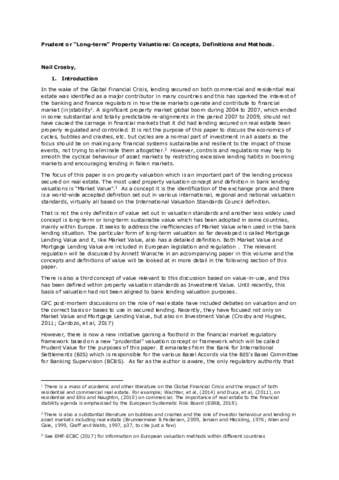 This paper addresses property valuation methodology and discusses issues connected to the feasibility of implementing a Basel III instigated prudent valuation regime to replace or supplement the existing approaches of Market Value and Mortgage Lending Value used for bank lending and financial regulation purposes. The EU are considering implementing Prudent Value within Europe but the implications of this discussion may be felt globally if other jurisdictions seek to implement this aspect of the Basel Accord. The questions to be addressed are: • What are the different definitions of property valuation, what do they actually mean, and can the definitions be transposed into a meaningful approach that creates the correct basis for lending decisions and monitoring of those decisions? • What are the precise details of any methods that can be developed to deliver these valuations and do valuers have the ability and the resources to deliver these valuations? • What are the alternatives and what infrastructure needs to be developed to enable valuers to deliver a prudent valuation regime? This paper is based on evidence presented to the EU which was developed with the co-operation of the three major valuation institutions concerned with valuations in Europe; the International Valuation Standards Council (IVSC), The European Group of Valuers (TEGOVA) and the Royal Institution of Chartered Surveyors (RICS) (Crosby and Hordijk, 2021)