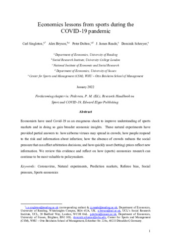 Uncontrolled Keywords | Coronavirus, Natural experiments, Prediction markets, Referee bias, Social pressure, Sports economics |