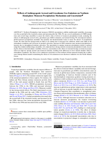 Effects of anthropogenic aerosol and greenhouse gas emissions on Northern Hemisphere monsoon precipitation: mechanisms and uncertainty.