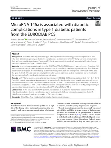 Barutta, F., Corbetta, B., Bellini, S., Guarrera, S., Matullo, G., Scandella, M., Schalkwijk, C., Stehouwer, C. D., Chaturvedi, N., Soedamah‑Muthu, S. S., Durazzo, M. and Gruden, G. (2021) MicroRNA 146a is associated with diabetic complications in type 1 diabetic patients from the EURODIAB PCS. Journal of Translational Medicine, 19. 475. ISSN 1479-5876 doi: 10.1186/s12967-021-03142-4