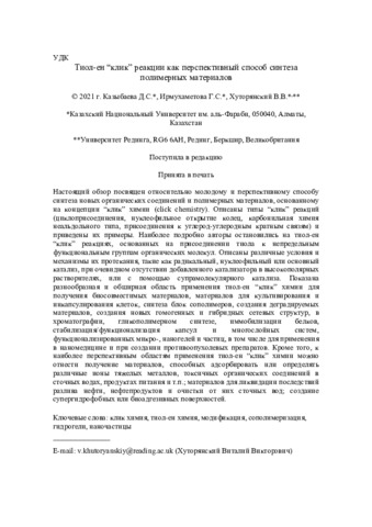 Kazybayeva, D. S., Irmukhametova, G. S. and Khutoryanskiy, V. V. orcid id iconORCID: https://orcid.org/0000-0002-7221-2630 (2022) Thiol-ene “click reactions” as a promising approach to polymer materials. Polymer Science, Series B, 64. pp. 1-16. ISSN 1555-6123 doi: 10.1134/S1560090422010055