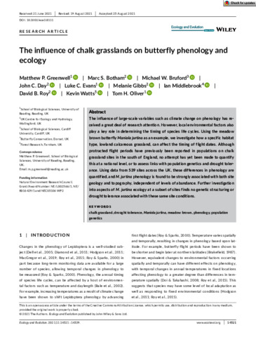 Greenwell, M. P. orcid id iconORCID: https://orcid.org/0000-0001-5406-6222, Botham, M. S. orcid id iconORCID: https://orcid.org/0000-0002-5276-1405, Bruford, M. W. orcid id iconORCID: https://orcid.org/0000-0001-6357-6080, Day, J. C. orcid id iconORCID: https://orcid.org/0000-0002-5483-4487, Evans, L. C. orcid id iconORCID: https://orcid.org/0000-0001-8649-0589, Gibbs, M. orcid id iconORCID: https://orcid.org/0000-0002-4091-9789, Middlebrook, I. orcid id iconORCID: https://orcid.org/0000-0002-0448-9144, Roy, D. B. orcid id iconORCID: https://orcid.org/0000-0002-5147-0331, Watts, K. orcid id iconORCID: https://orcid.org/0000-0002-1832-9475 and Oliver, T. H. orcid id iconORCID: https://orcid.org/0000-0002-4169-7313 (2021) The influence of chalk grasslands on butterfly phenology and ecology. Ecology and Evolution, 11 (21). pp. 14521-14539. ISSN 2045-7758 doi: 10.1002/ece3.8111