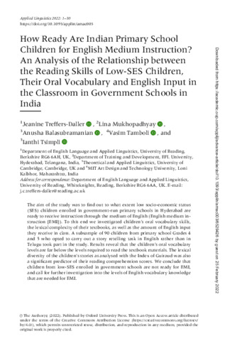 Treffers-Daller, J. orcid id iconORCID: https://orcid.org/0000-0002-6575-6736, Mukhopadhyay, L., Balasubramanian, A., Tamboli, V. and Tsimpli, I. (2022) How ready are Indian primary school children for English medium instruction? An analysis of the relationship between the reading skills of low SES children, their oral vocabulary and English input in the classroom in government schools in India. Applied Linguistics, 43 (4). pp. 746-775. ISSN 1477-450X doi: 10.1093/applin/amac003