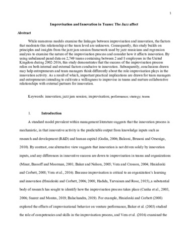 Audretsch, D. B., Belitski, M. orcid id iconORCID: https://orcid.org/0000-0002-9895-0105 and Herzig, M. (2023) Improvisation and innovation in teams: the jazz effect. British Journal of Management, 34 (1). pp. 150-170. ISSN 1467-8551 doi: 10.1111/1467-8551.12588