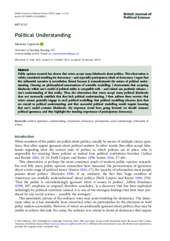 Public opinion research has shown that voters accept many falsehoods about politics. This observation is widely considered troubling for democracy—and especially participatory ideals of democracy. I argue that this influential narrative is nevertheless flawed, because it misunderstands the nature of political understanding. Drawing on philosophical examinations of scientific modelling, I demonstrate that accepting falsehoods within one’s model of political reality is compatible with—and indeed can positively enhance—one’s understanding of that reality. Thus, the observation that voters accept many political falsehoods does not necessarily establish that they lack political understanding. I then address three worries: that voters cannot generally engage in such political modelling; that political modelling obscures facts that are crucial to political understanding; and that successful political modelling would require knowing that one’s model contains falsehoods. My responses reveal how, going forward, we should measure political ignorance; and they highlight the standing importance of participatory democracy.