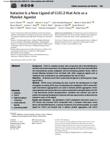 Morán, L. A., Di, Y., Sowa, M. A., Hermida-Nogueira, L., Barrachina, M. N., Martin, E., Clark, J. C., Mize, T. H., Eble, J. A., Moreira, D., Pollitt, A. Y. ORCID: https://orcid.org/0000-0001-8706-5154, Loza, M. I., Domínguez, E., Watson, S. P. and Garcia, Á.
