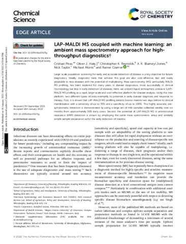 Piras, C., Hale, O. J., Reynolds, C. K. orcid id iconORCID: https://orcid.org/0000-0002-4152-1190, Jones, A. K. (B.), Taylor, N., Morris, M. and Cramer, R. orcid id iconORCID: https://orcid.org/0000-0002-8037-2511 (2022) LAP-MALDI MS coupled with machine learning: an ambient mass spectrometry approach for high-throughput diagnostics. Chemical Science, 13 (6). pp. 1746-1758. ISSN 1478-6524 doi: 10.1039/D1SC05171G