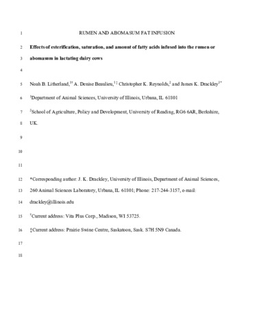 Effects of esterification, saturation, and amount of fatty acids infused into the rumen or abomasum in lactating dairy cows.