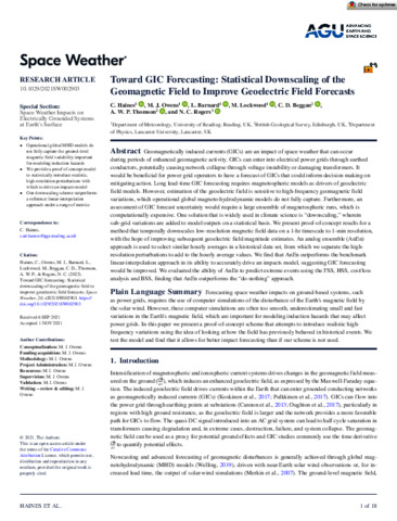 Haines, C., Owens, M. J. orcid id iconORCID: https://orcid.org/0000-0003-2061-2453, Barnard, L. orcid id iconORCID: https://orcid.org/0000-0001-9876-4612, Lockwood, M. orcid id iconORCID: https://orcid.org/0000-0002-7397-2172, Beggan, C. D., Thomson, A. W. P. and Rogers, N. C. (2022) Towards GIC forecasting: statistical downscaling of the geomagnetic field to improve geoelectric field forecasts. Space Weather, 20 (1). e2021SW002903. ISSN 1542-7390 doi: 10.1029/2021SW002903