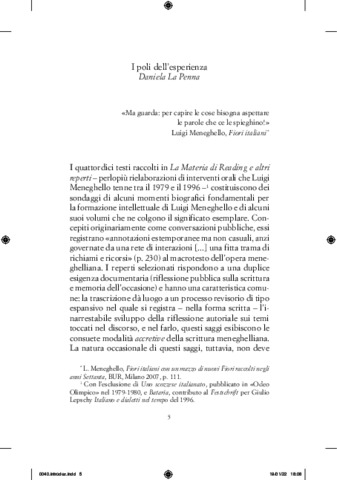 This essay provides an analysis of the collections of essays La materia di Reading e altri reperti by Luigi Meneghello. The author highlights the role that the essays have in the overall work of Meneghello and highlights the textual function they play in the supporting the understanding of Meneghello's novels.