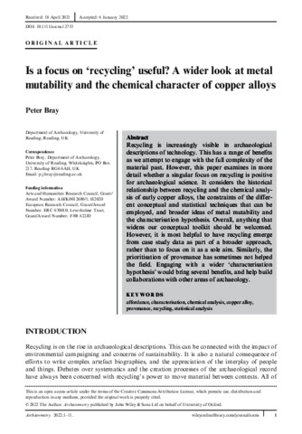 Bray, P. (2022) Is a focus on ‘recycling’ useful? A wider look at metal mutability and the chemical character of copper‐alloys. Archaeometry, 64 (S1). pp. 87-97. ISSN 1475-4754 doi: 10.1111/arcm.12753