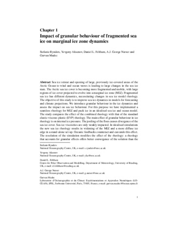 Rynders, S., Aksenov, Y., Feltham, D. L. orcid id iconORCID: https://orcid.org/0000-0003-2289-014X, Nurser, A. J. G. and Madec, G. (2022) Impact of granular behaviour of fragmented sea ice on marginal ice zone dynamics. In: IUTAM Symposium on Physics and Mechanics of Sea Ice, 3-9 Jun 2019, Aalto University, Espoo, Finland. doi: 10.1007/978-3-030-80439-8_13