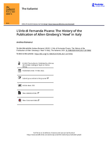 Romanzi, A. (2021) L’Urlo di Fernanda Pivano: the history of the publication of Allen Ginsberg’s Howl in Italy. The Italianist, 41 (3). pp. 424-445. ISSN 1748-619X doi: 10.1080/02614340.2021.2015992