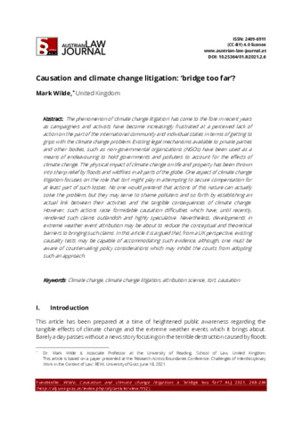 Wilde, M. (2021) Causation and climate change litigation: 'bridge too far?'. Austrian Law Journal, 8 (2). p. 268. ISSN 2409-6911 doi: 10.25364/01.8:2021.2.6