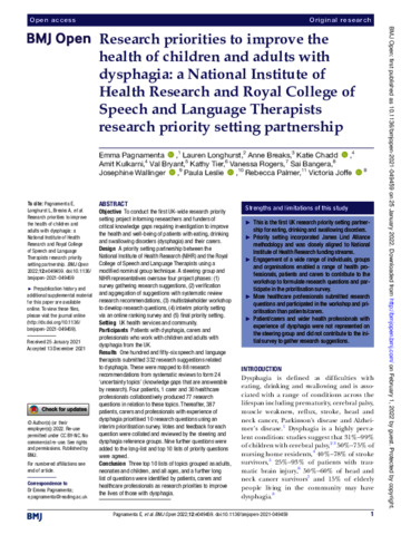Research priorities to improve the health of children and adults with dysphagia: a National Institute of Health Research and Royal College of Speech and Language Therapists Research Priority Setting Partnership.