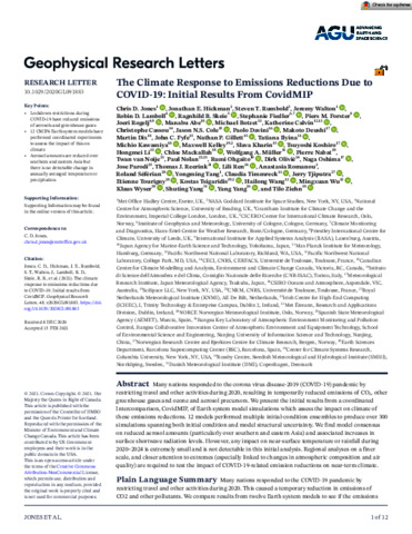 Many nations responded to the corona virus disease-2019 (COVID-19) pandemic by restricting travel and other activities during 2020, resulting in temporarily reduced emissions of CO2, other greenhouse gases and ozone and aerosol precursors. We present the initial results from a coordinated Intercomparison, CovidMIP, of Earth system model simulations which assess the impact on climate of these emissions reductions. 12 models performed multiple initial-condition ensembles to produce over 300 simulations spanning both initial condition and model structural uncertainty. We find model consensus on reduced aerosol amounts (particularly over southern and eastern Asia) and associated increases in surface shortwave radiation levels. However, any impact on near-surface temperature or rainfall during 2020–2024 is extremely small and is not detectable in this initial analysis. Regional analyses on a finer scale, and closer attention to extremes (especially linked to changes in atmospheric composition and air quality) are required to test the impact of COVID-19-related emission reductions on near-term climate.