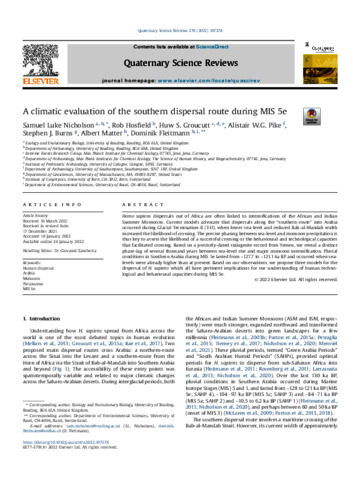 Nicholson, S. L. orcid id iconORCID: https://orcid.org/0000-0002-6760-0321, Hosfield, R. orcid id iconORCID: https://orcid.org/0000-0001-6357-2805, Groucutt, H. S. orcid id iconORCID: https://orcid.org/0000-0002-9111-1720, Pike, A. W. G., Burns, S. J., Matter, A. and Fleitmann, D. (2022) A climatic evaluation of the southern dispersal route during MIS 5e. Quaternary Science Reviews, 279. 107378. ISSN 02773791 doi: 10.1016/j.quascirev.2022.107378