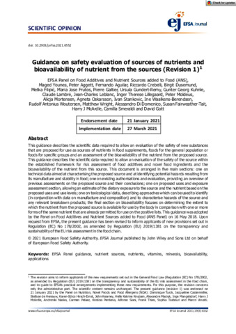 This guidance describes the scientific data required to allow an evaluation of the safety of new substances that are proposed for use as sources of nutrients in food supplements, foods for the general population or foods for specific groups and an assessment of the bioavailability of the nutrient from the proposed source. This guidance describes the scientific data required to allow an evaluation of the safety of the source within the established framework for risk assessment of food additives and novel food ingredients and the bioavailability of the nutrient from this source. This document is arranged in five main sections: one on technical data aimed at characterising the proposed source and at identifying potential hazards resulting from its manufacture and stability in food; one on existing authorisations and evaluation, providing an overview of previous assessments on the proposed source and their conclusions; one on proposed uses and exposure assessment section, allowing an estimate of the dietary exposure to the source and the nutrient based on the proposed uses and use levels; one on toxicological data, describing approaches which can be used to identify (in conjunction with data on manufacture and composition) and to characterise hazards of the source and any relevant breakdown products; the final section on bioavailability focuses on determining the extent to which the nutrient from the proposed source is available for use by the body in comparison with one or more forms of the same nutrient that are already permitted for use on the positive lists. This guidance was adopted by the Panel on Food Additives and Nutrient Sources added to Food (ANS Panel) on 16 May 2018. Upon request from EFSA, the present guidance has been revised to inform applicants of new provisions set out in Regulation (EC) No 178/2002, as amended by Regulation (EU) 2019/1381 on the transparency and sustainability of the EU risk assessment in the food chain.