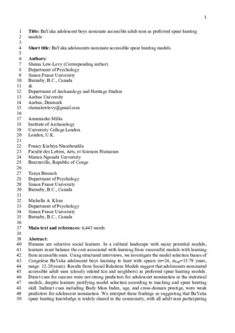 BaYaka adolescent boys nominate accessible adult men as preferred spear hunting models.