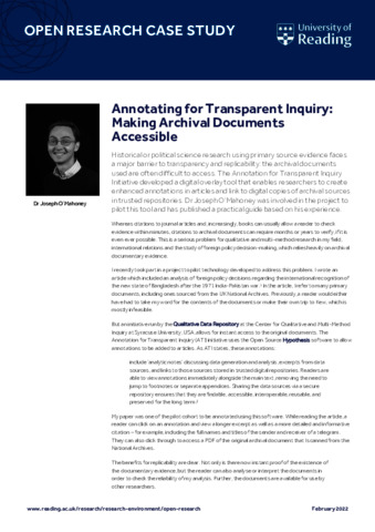 Historical or political science research using primary source evidence faces a major barrier to transparency and replicability: the archival documents used are often difficult to access. The Annotation for Transparent Inquiry Initiative developed a digital overlay tool that enables researchers to create enhanced annotations in articles and link to digital copies of archival sources in trusted repositories. Dr Joseph O’Mahoney was involved in the project to pilot this tool and has published a practical guide based on his experience.