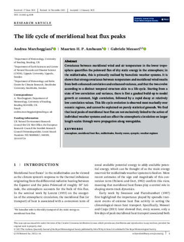 Covariance between meridional wind and air temperature in the lower troposphere quantifies the poleward flux of dry static energy in the atmosphere; in the mid-latitudes, this is primarily realised by baroclinic weather systems. It is shown that strong covariance between temperature and meridional wind results from both enhanced correlation and enhanced variance, and that the two evolve according to a distinct temporal structure akin to a life-cycle. Starting from a state of low correlation and variance, there is first a gradual build up to modal growth at constant, high correlation, followed by a rapid decay at relatively low correlation values. This life-cycle evolution is observed most markedly over oceanic regions, and cannot be explained on purely statistical grounds. We find that local peaks of meridional heat flux are not exclusively linked to the action of individual weather systems and can affect the atmospheric circulation on larger length scales through wave propagation along wave guides.