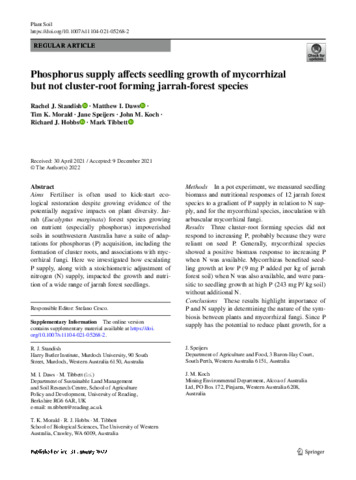 Phosphorus supply affects seedling growth of mycorrhizal but not cluster-root forming jarrah-forest species.