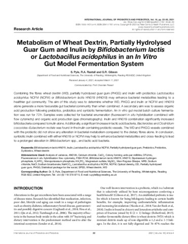 Metabolism of wheat dextrin, partially hydrolysed guar gum and insulin combined with either Bifidobacterium lactis or Lactobacillus acidophilus in an in vitro gut model fermentation.