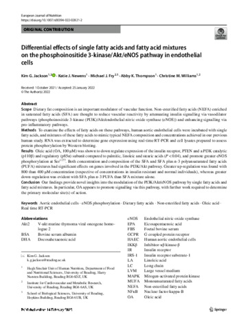 Jackson, K. G. orcid id iconORCID: https://orcid.org/0000-0002-0070-3203, Newens, K. J., Fry, M. J., Thompson, A. K. and Williams, C. M. (2022) Differential effects of single fatty acids and fatty acid mixtures on the phosphoinositide 3-kinase/Akt/eNOS pathway in endothelial cells. European Journal of Nutrition, 61. pp. 2463-2473. ISSN 1436-6215 doi: 10.1007/s00394-022-02821-2