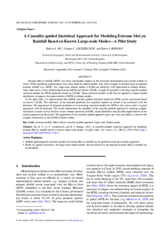 Ng, K. S., Leckebusch, G. C. and Hodges, K. I. orcid id iconORCID: https://orcid.org/0000-0003-0894-229X (2022) A causality-guided statistical approach for modelling extreme mei-yu rainfall based on known large-scale modes – a pilot study. Advances in Atmospheric Sciences, 39. pp. 1925-1940. ISSN 0256-1530 doi: 10.1007/s00376-022-1348-3