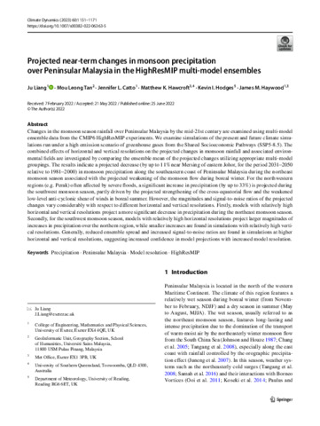 Liang, J., Tan, M. L., Catto, J. L., Hawcroft, M. K., Hodges, K. I. orcid id iconORCID: https://orcid.org/0000-0003-0894-229X and Haywood, J. M. (2023) Projected near-term changes in monsoon precipitation over Peninsular Malaysia in the HighResMIP multi-model ensembles. Climate Dynamics, 60. pp. 1151-1171. ISSN 0930-7575 doi: 10.1007/s00382-022-06363-5