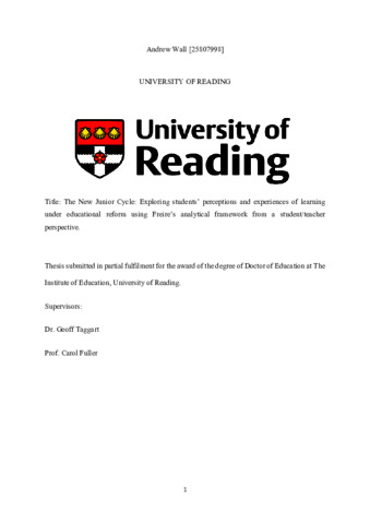 Wall, A. (2021) The New Junior Cycle: exploring students’ perceptions and experiences of learning under educational reform using Freire’s analytical framework from a student/teacher perspective. PhD thesis, University of Reading. doi: 10.48683/1926.00103111