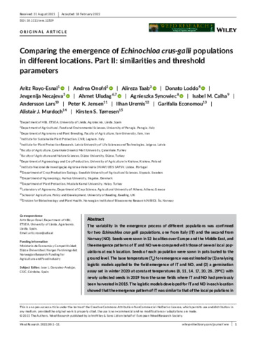 Royo-Esnal, A., Onofri, A., Taab, A., Loddo, D., Necajeva, J., Uludag, A., Synowiec, A., Calha, I. M., Lars, A., Jensen, P. K., Uremis, I., Economou, G., Murdoch, A. J. and Tørresen, K. S. (2022) Comparing the emergence of Echinochloa crus-galli populations in different locations. Part II: similarities and threshold parameters. Weed Research, 62 (3). pp. 203-214. ISSN 0043-1737 doi: 10.1111/wre.12529