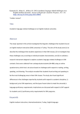 The study reported in this article investigated the linguistic challenges that students face at an English medium instruction (EMI) university in Turkey. The aims of the study were (1) to describe the challenges that students experience in their EMI classes; (2) to investigate how these challenges vary according to individual student characteristics; and (3) to validate a research instrument designed to explore academic language-related challenges in EMI contexts. Data were collected from undergraduate students (N = 498) using an online questionnaire, which had a structure based on challenges with respect to reading, writing, speaking, and listening. The analysis revealed that students found writing and speaking to be the most challenging areas in their EMI classes. The study also found significant differences in the challenges reported by students with respect to academic discipline, L1 background, prior EMI experience, and the type of exam taken to meet the university’s language proficiency requirements. Implications are discussed with respect to EAP support for students and L2 proficiency entry requirements for EMI programs.