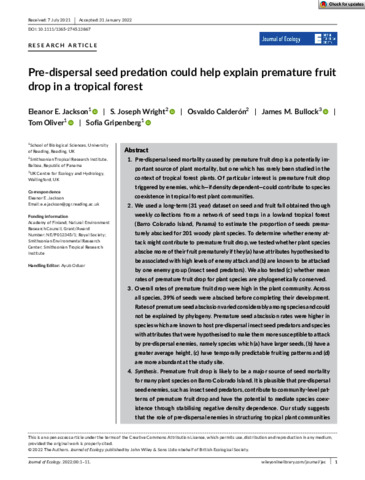 Pre-dispersal seed mortality caused by premature fruit drop is a potentially important source of plant mortality, but one which has rarely been studied in the context of tropical forest plants. Of particular interest is premature fruit drop triggered by enemies, which—if density dependent—could contribute to species coexistence in tropical forest plant communities. We used a long-term (31 year) dataset on seed and fruit fall obtained through weekly collections from a network of seed traps in a lowland tropical forest (Barro Colorado Island, Panama) to estimate the proportion of seeds prematurely abscised for 201 woody plant species. To determine whether enemy attack might contribute to premature fruit drop, we tested whether plant species abscise more of their fruit prematurely if they (a) have attributes hypothesised to be associated with high levels of enemy attack and (b) are known to be attacked by one enemy group (insect seed predators). We also tested (c) whether mean rates of premature fruit drop for plant species are phylogenetically conserved. Overall rates of premature fruit drop were high in the plant community. Across all species, 39% of seeds were abscised before completing their development. Rates of premature seed abscission varied considerably among species and could not be explained by phylogeny. Premature seed abscission rates were higher in species which are known to host pre-dispersal insect seed predators and species with attributes that were hypothesised to make them more susceptible to attack by pre-dispersal enemies, namely species which (a) have larger seeds, (b) have a greater average height, (c) have temporally predictable fruiting patterns and (d) are more abundant at the study site. Synthesis. Premature fruit drop is likely to be a major source of seed mortality for many plant species on Barro Colorado Island. It is plausible that pre-dispersal seed enemies, such as insect seed predators, contribute to community-level patterns of premature fruit drop and have the potential to mediate species coexistence through stabilising negative density dependence. Our study suggests that the role of pre-dispersal enemies in structuring tropical plant communities should be considered alongside the more commonly studied post-dispersal seed and seedling enemies.