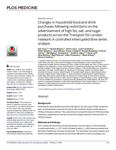 Yau, A., Berger, N., Law, C. orcid id iconORCID: https://orcid.org/0000-0003-0686-1998, Cornelsen, L., Greener, R., Adams, J., Boyland, E. J., Burgoine, T., de Vocht, F., Egan, M., Er, V., Lake, A. A., Lock, K., Mytton, O., Petticrew, M., Thompson, C., White, M. and Cummins, S. (2022) Changes in household food and drink purchases following restrictions on the advertisement of high fat, salt, and sugar products across the Transport for London network: a controlled interrupted time series analysis. PLoS Medicine, 19 (2). e1003915. ISSN 1549-1676 doi: 10.1371/journal.pmed.1003915