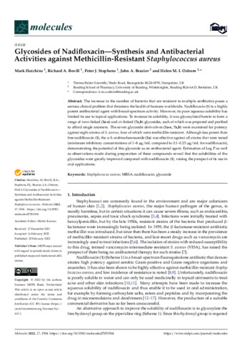 Hutchins, M., Bovill, R. A., Stephens, P. J., Brazier, J. A. orcid id iconORCID: https://orcid.org/0000-0002-4952-584X and Osborn, H. M. I. orcid id iconORCID: https://orcid.org/0000-0002-0683-0457 (2022) Glycosides of nadifloxacin—synthesis and antibacterial activities against methicillin-resistant Staphylococcus aureus. Molecules, 27 (5). 1504. ISSN 1420-3049 doi: 10.3390/molecules27051504