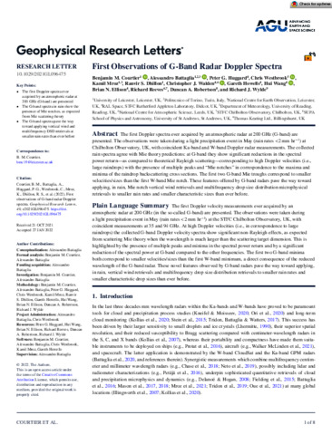 The first Doppler spectra ever acquired by an atmospheric radar at 200 GHz (G-band) are presented. The observations were taken during a light precipitation event in May (rain rates <2 mm hr−1) at Chilbolton Observatory, UK, with coincident Ka-band and W-band Doppler radar measurements. The collected rain spectra agree with Mie theory predictions: at G-band they show significant reductions in the spectral power return—as compared to theoretical Rayleigh scattering—corresponding to high Doppler velocities (i.e., large raindrops) with the presence of multiple peaks and “Mie notches” in correspondence to the maxima and minima of the raindrop backscattering cross sections. The first two G-band Mie troughs correspond to smaller velocities/sizes than the first W-band Mie notch. These features offered by G-band radars pave the way toward applying, in rain, Mie notch vertical wind retrievals and multifrequency drop size distribution microphysical retrievals to smaller rain rates and smaller characteristic sizes than ever before.