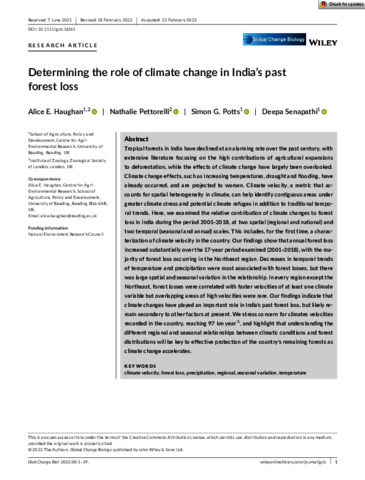 Tropical forests in India have declined at an alarming rate over the past century, with extensive literature focusing on the high contributions of agricultural expansions to deforestation, while the effects of climate change have largely been overlooked. Climate change effects, such as increasing temperatures, drought and flooding have already occurred, and are projected to worsen. Climate velocity, a metric that accounts for spatial heterogeneity in climate, can help identify contiguous areas under greater climate stress and potential climate refuges in addition to traditional temporal trends. Here, we examined the relative contribution of climate changes to forest loss in India during the period 2001-2018, at two spatial (regional and national) and two temporal (seasonal and annual) scales. This includes, for the first time, a characterisation of climate velocity in the country. Our findings show that annual forest loss increased substantially over the 17 year period examined (2001-2018), with the majority of forest loss occurring in the Northeast region. Decreases in temporal trends of temperature and precipitation were most associated with forest losses but there was large spatial and seasonal variation in the relationship. In every region except the Northeast, forest losses were correlated with faster velocities of at least one climate variable but overlapping areas of high velocities were rare. Our findings indicate that climate changes have played an important role in India’s past forest loss, but likely remain secondary to other factors at present. We stress concern for climates velocities recorded in the country, reaching 97km yr-1, and highlight that understanding the different regional and seasonal relationships between climatic conditions and forest distributions will be key to effective protection of the country’s remaining forests as climate change accelerates.